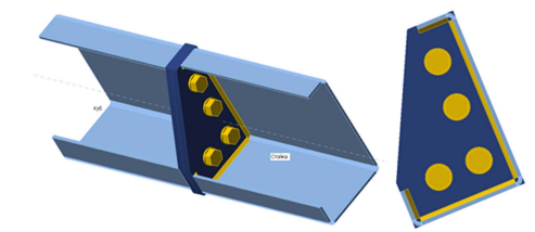 Угловые элементы панелей перекрытий жестко соединены с горизонтальными балками. Вертикальные стойки крепятся к угловым элементам четырьмя болтами М16 через угловые фланцы толщиной 12 мм. Геометрические характеристики узла представлены на рис. 1. Общий вид расчетной модели узла представлен на рис. 2.