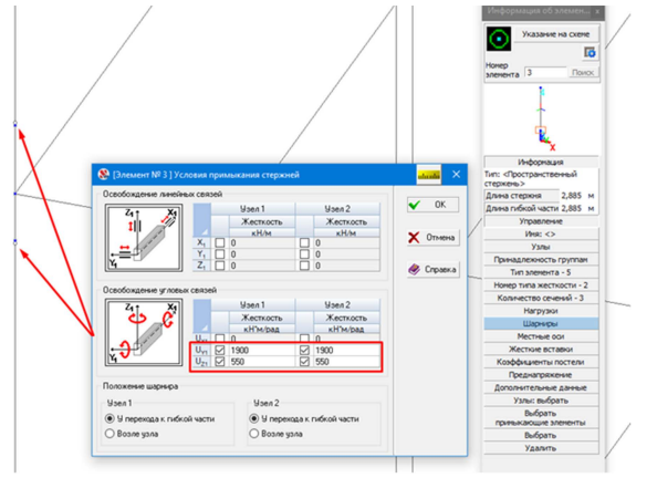 Полученные коэффициенты угловой жесткости узла задаются в расчетную схему в SCAD Office как жесткости шарниров по направлению действия моментов Му и Мz.