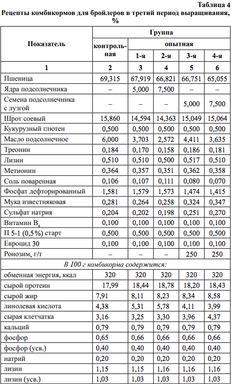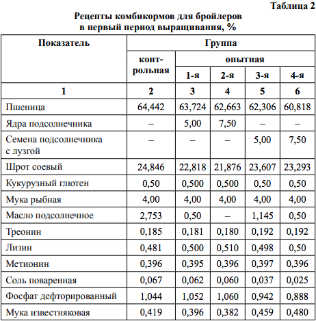 Рецепты комбикормов для бройлеров по периодам выращивания представлены в табл. 2–4.