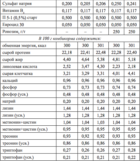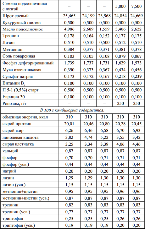 При вводе в комбикорма ядер подсолнечника в основном происходила замена соевого шрота, тогда как при включении семян подсолнечника – пшеницы. Комбикорма с семенами подсолнечника дополнительно обогащали ферментным препаратом Ронозим.