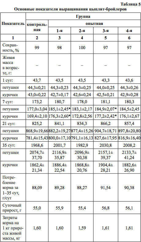 Результаты исследований показали, что продуктивность цыплятбройлеров опытных групп, в которых использовали ядра и семена подсолнечника, не уступала показателям контрольной группы. Так, уже в 7-суточном возрасте живая масса цыплят-бройлеров во всех опытных группах была больше, чем в контрольной группе. Данная тенденция превосходства опытных групп над показателями контрольной группы сохранялась на протяжении всего периода выращивания и в 35-суточном возрасте масса петушков и курочек 1-й и 2-й опытных групп была больше на 1,1–2,0 % и 0,3–1,3 %, а 3-й и 4-й – на 2,8–4,0 % и 1,1–2,3 %.