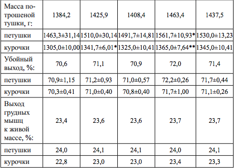Масса потрошеной тушки, убойный выход и выход грудных мышц у цыплят опытных групп находились выше уровня контрольной группы.