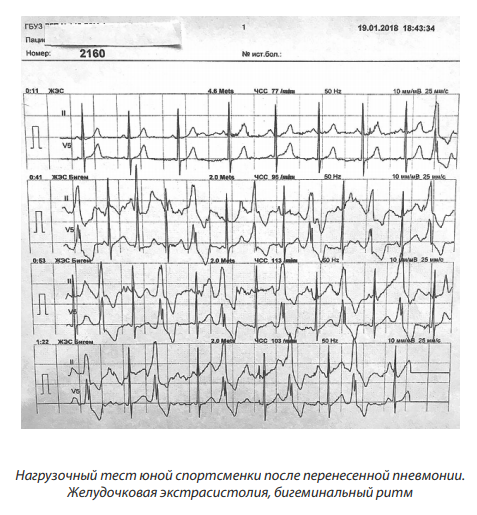Спортсменка, 17 лет, 7 лет занимается акробатическим рок-н-роллом. Проходила диспансеризацию перед предстоящими соревнованиями в октябре 2018 г. Жалоб не предъявляла, при физикальном обследовании патологии не выявлено, температура тела нормальная. На ЭКГ — синусовая брадикардия. Эхокардиография без патологии. На нагрузочном тесте при ЧСС 141 уд/мин появилась частая желудочковая экстрасистолия, эпизоды бигеминии и парной однонаправленной желудочковой экстрасистолии, пробежка неустойчивой желудочковой тахикардии из четырех комплексов. Проба была прекращена. В первую минуту восстановления регистрировалась частая желудочковая экстрасистолия, желудочковая бигеминия. Со второй минуты восстановления нарушения ритма не регистрировались. После нагрузочного теста спортсменка призналась, что в течение недели беспокоят незначительный насморк, небольшая слабость. Холтеровское мониторирование было проведено через неделю. Средняя ЧСС 78 уд/мин, минимальная ЧСС — 38, максимальная ЧСС 165 уд/мин (физическая нагрузка), пауз более 1750 мс не выявлено. В пассивный период регистрировались единичные эпизоды синоатриальной (СА) блокады 2-й ст. Наджелудочковой и желудочковой эктопической активности не выявлено. Еще через неделю был проведен повторно нагрузочный тест. Максимальная ЧСС — 170 уд/мин, нарушения ритма на нагрузке и в период восстановления выявлено не было. В этот период симптомы заболевания отсутствовали.