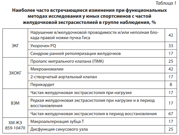 Экстрасистолия может быть результатом перетренированности и единственным признаком миокардита. Так же как у детей и подростков, не занимающихся спортом, желудочковая экстрасистолия может носить идиопатический характер или быть симптомом заболеваний, ассоциированных с риском внезапной смерти [5, 7, 12, 17].