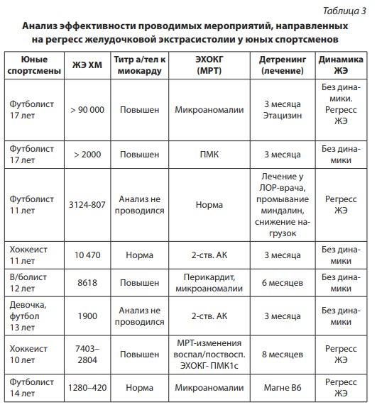Эффективными оказались методы санации очагов хронической инфекции и прием препаратов магния. Хороший эффект дал антиаритмический препарат, назначенный юному футболисту диагностическим центром, но в дальнейшем этот спортсмен не был допущен нами до занятий спортом. Наличие бигеминального желудочкового ритма на нагрузочном тесте у юной спортсменки после перенесенной пневмонии и допустимое количество желудочковых экстрасистол в 24-часовом исследовании подтверждают предположение авторов, что количество экстрасистол не может быть в полной мере определяющим фактором для допуска к занятиям спортом.