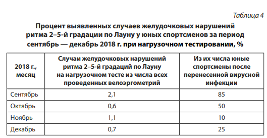 Представленность видами спорта и возрастные категории были сопоставимы по месяцам. В 80–90 % случаях желудочковые нарушения ритма регистрировались только в период восстановления. Провести такой анализ нас подтолкнули факты выявления частых нарушений сердечного ритма у юных спортсменов, начиная с сентября, когда основная масса детей и подростков только начала тренировки после летнего отдыха. Но был один факт, который объединял этих юных спортсменов, его пытались скрыть сами спортсмены или не придавали ему значения. Большая часть детей и подростков были после перенесенной вирусной инфекции 1–2 недели или имели некоторые проявления болезни на период диспансеризации (остаточные явления, редкий кашель, небольшой насморк, начальные проявления заболевания по типу болей в горле при нормальной температуре), но практически все посещали тренировки. После сентября был зафиксирован спад клинических проявлений вирусной инфекции и, соответственно, уменьшился процент выявленных желудочковых нарушений ритма, связанных с инфекцией. С началом второй волны заболевания, с середины декабря 2018 г., при возросшем числе реконвалесцентов мы не выявили роста желудочковых нарушений ритма при нагрузочном тестировании. Данные наблюдения представлены в таблице 4.
