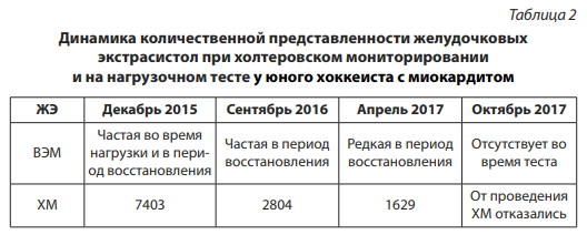 В нашем исследовании только одному юному спортсмену была проведена магнитно-резонансная томография с гадолинием, что помогло в подтверждении диагноза и определении тактики ведения. После 8-месячного детренинга количество желудочковых экстрасистол у юного хоккеиста сократилось более чем в два раза. Мы обратили внимание, что только 50 % юных спортсменов с частой желудочковой экстрасистолией отвечают регрессом ее количества на детренинг не менее чем три месяца.